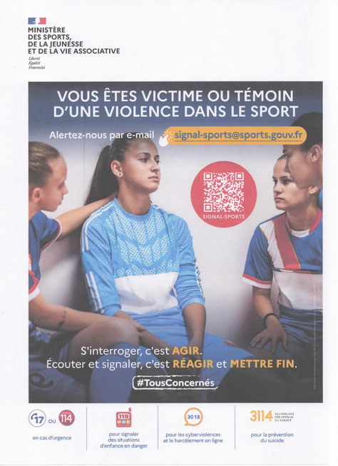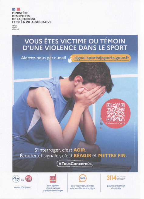 L'article R.322-5 du Code du Sport précise que cet affichage doit être fait en un lieu visible de tous. Ces affiches indiquent les dispositifs permettant de recueillir des signalements, d'orienter et accompagner les personnes s'estimant victimes ou témoins de situations susceptibles d'être qualifiées de violences physiques ou morales ou de situations de maltraitance provenant notamment de propos discriminants, de bizutage, de situations d'emprise, ou encore d'éventuelles complicités et non dénonciations délictueuses de ces faits.